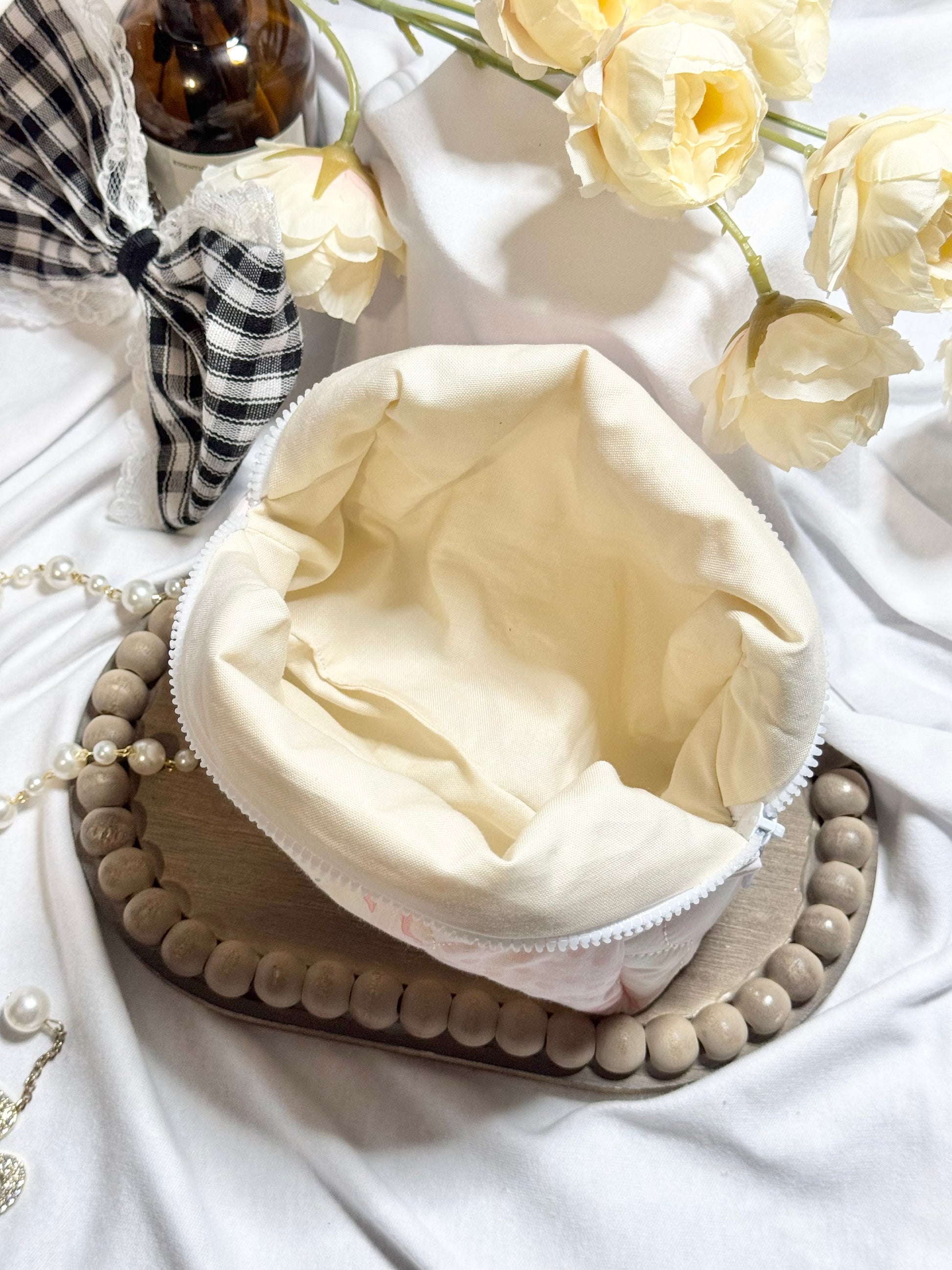 This handmade glam zipper pouch is both stylish and functional, perfect for storing makeup or everyday essentials.